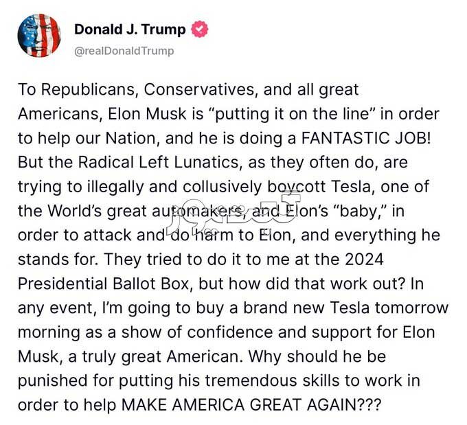 ترامپ در یک پست رسانه‌های اجتماعی گفت:«دیوانگان چپ رادیکال، همانطور که در حال خرابکاری هستند، در تلاشند تا به طور غیرقانونی و تبانی‌ آمیز، تسلا را تحریم کنند. در هر صورت، من فردا صبح یک تسلا کاملاً جدید به عنوان نشانه‌ای از اعتماد و حمایت از ایلان ماسک خریداری خواهم کرد.»